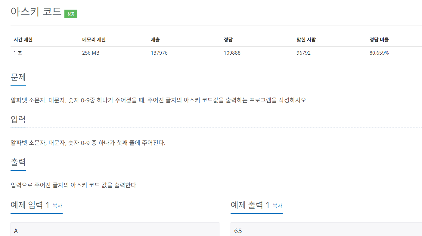 | #define _CRT_SECURE_NO_WARNINGS #include <stdio.h> int main() { char c; scanf("%c", &c); // 문자로 입력받은 변수를 정수로 출력하면 // ASCII 코드 값으로 출력된다. printf("%d", c); } |