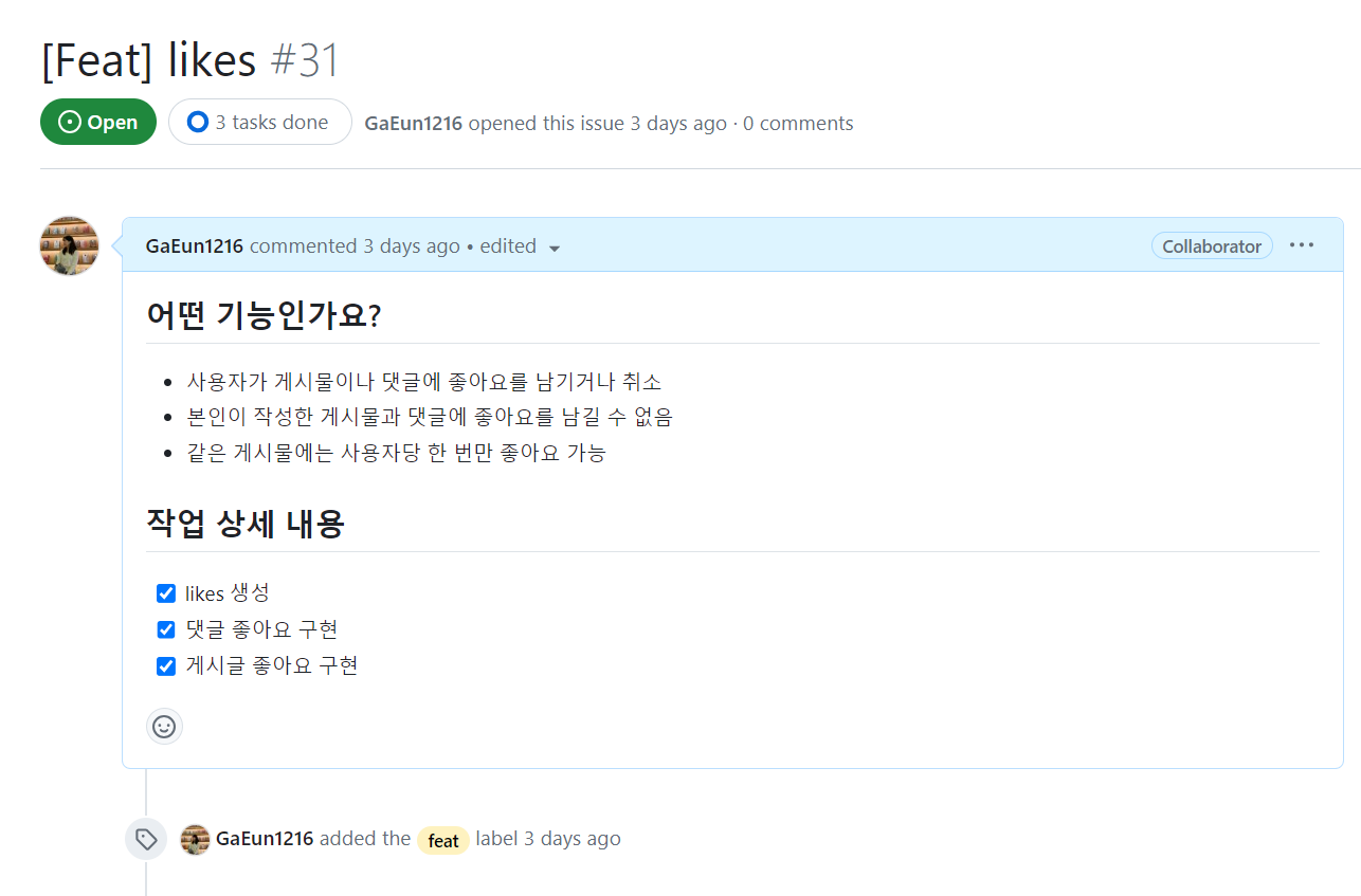 좋아요 엔티티를 만들기 위해 기존 프로젝트에서 이슈를 생성했다.