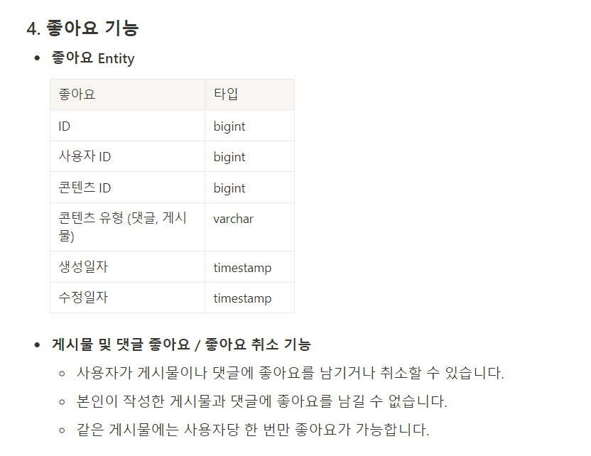 좋아요 엔티티에 대한 요구사항을 보면 하나의 엔티티에서 댓글 좋아요 / 게시글 좋아요를 모두 구현하도록 설계되어있었다.