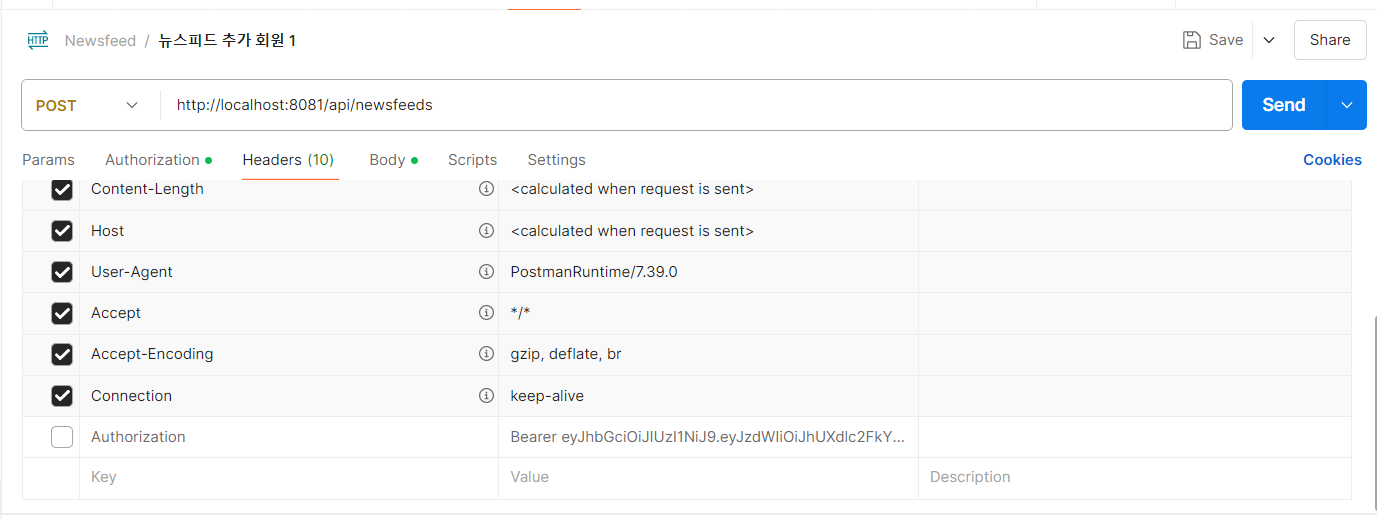 아 참 전에 사용하던 헤더의 Authorization은 체크 해제해야한다. 더이상 필요 없으니 삭제해도 된다.