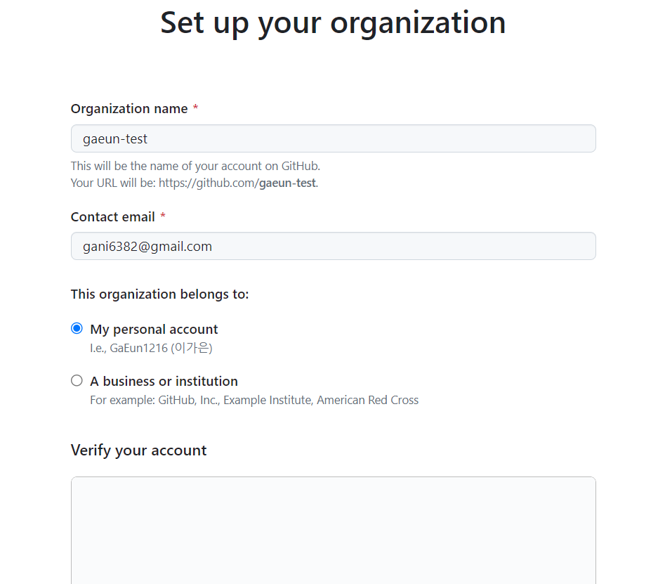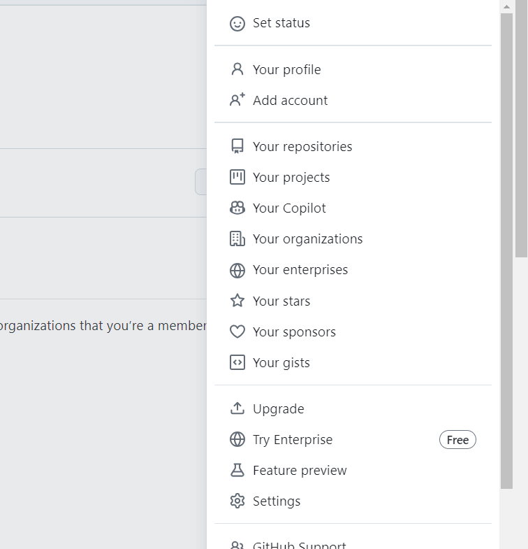 깃허브에 접속하여 프로필을 누르면 Your organization을 확인할 수 있다.