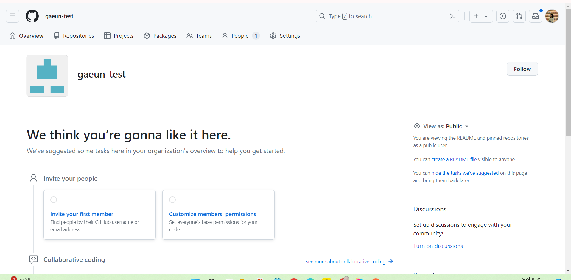 오늘은 깃허브 Organization을 만들어서 프로젝트를 시작했다.