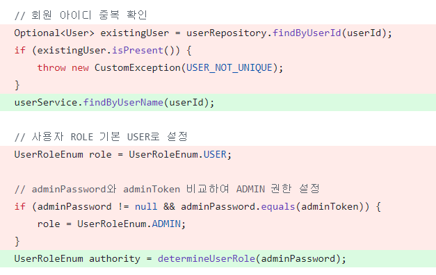 기존의 회원가입은 authService에서 중복회원 여부를 체크하고, 어드민인지 유저인지 확인한 후 response body에 메시지까지 처리하도록 구현했다. 그 결과, 가독성이 매우 떨어지는 코드가 되었고 관심사 분리로 리팩토링 과정을 거치게 됐다.