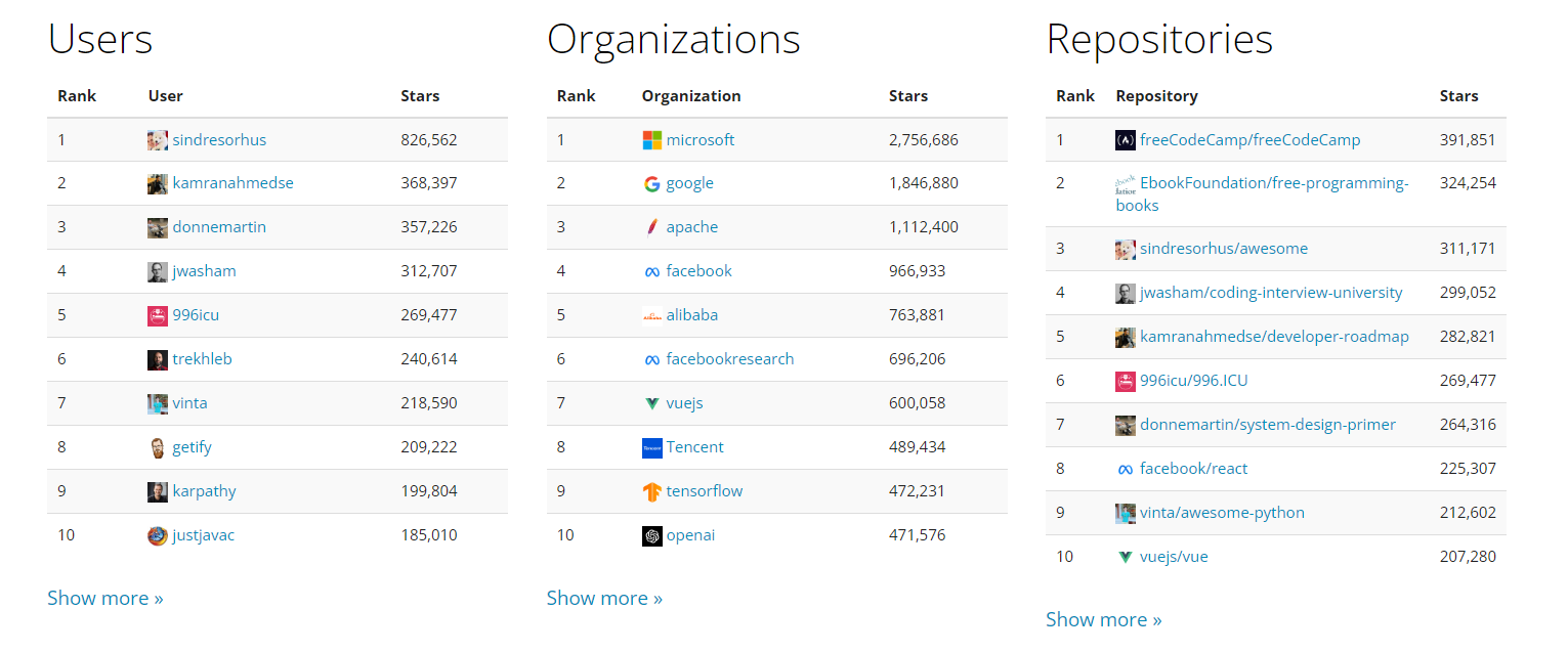 Gitstar Ranking Unofficial GitHub star ranking for users, organizations and repositories.