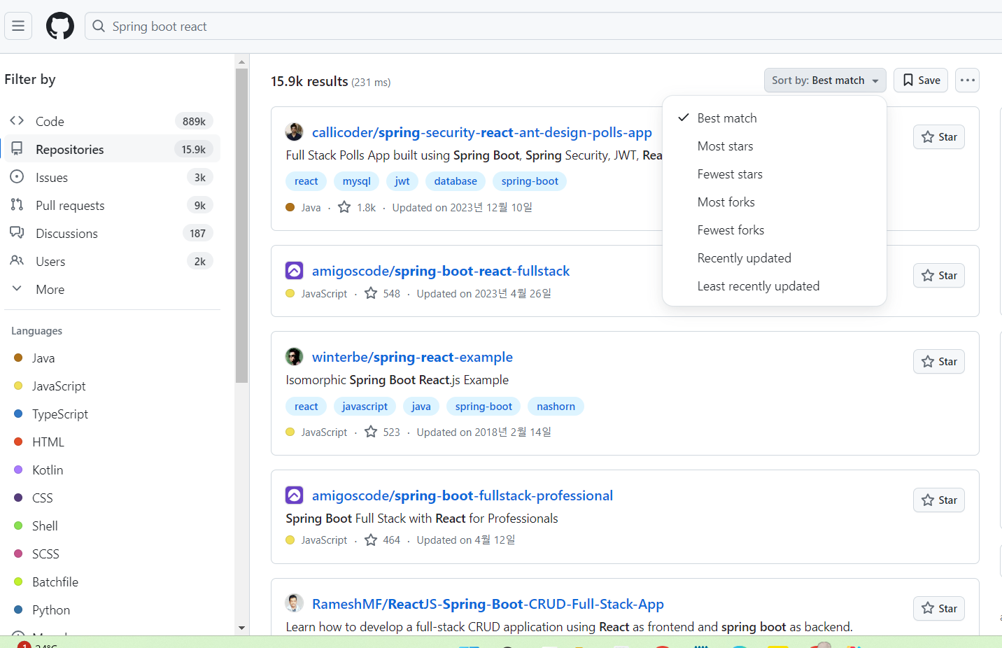 말 그대로 깃허브의 검색 기능을 이용하는 것이다.