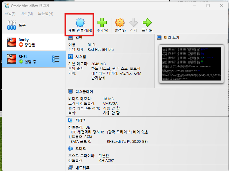 이미 VirtualBox와 RHEL ISO 파일이 준비되어있다는 가정하에 진행합니다.