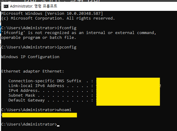 IPv4 Address와 유저명을 확인하면 된다. 사실 나처럼 C:\Users\Administrator>이 되어있는 경우