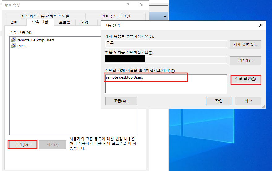 그룹 선택에 들어가서 remote desktop Users 라고 쳐주고 이름 확인을 누르면 자동 완성 기능으로 이름을 찾아준다.