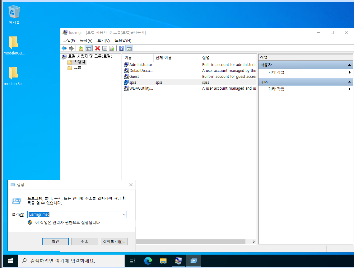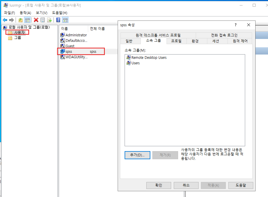 win + R 키를 눌러 실행창을 열어주고 lusrmgr.msc를 검색하여 사용자, 그룹을 켜준다